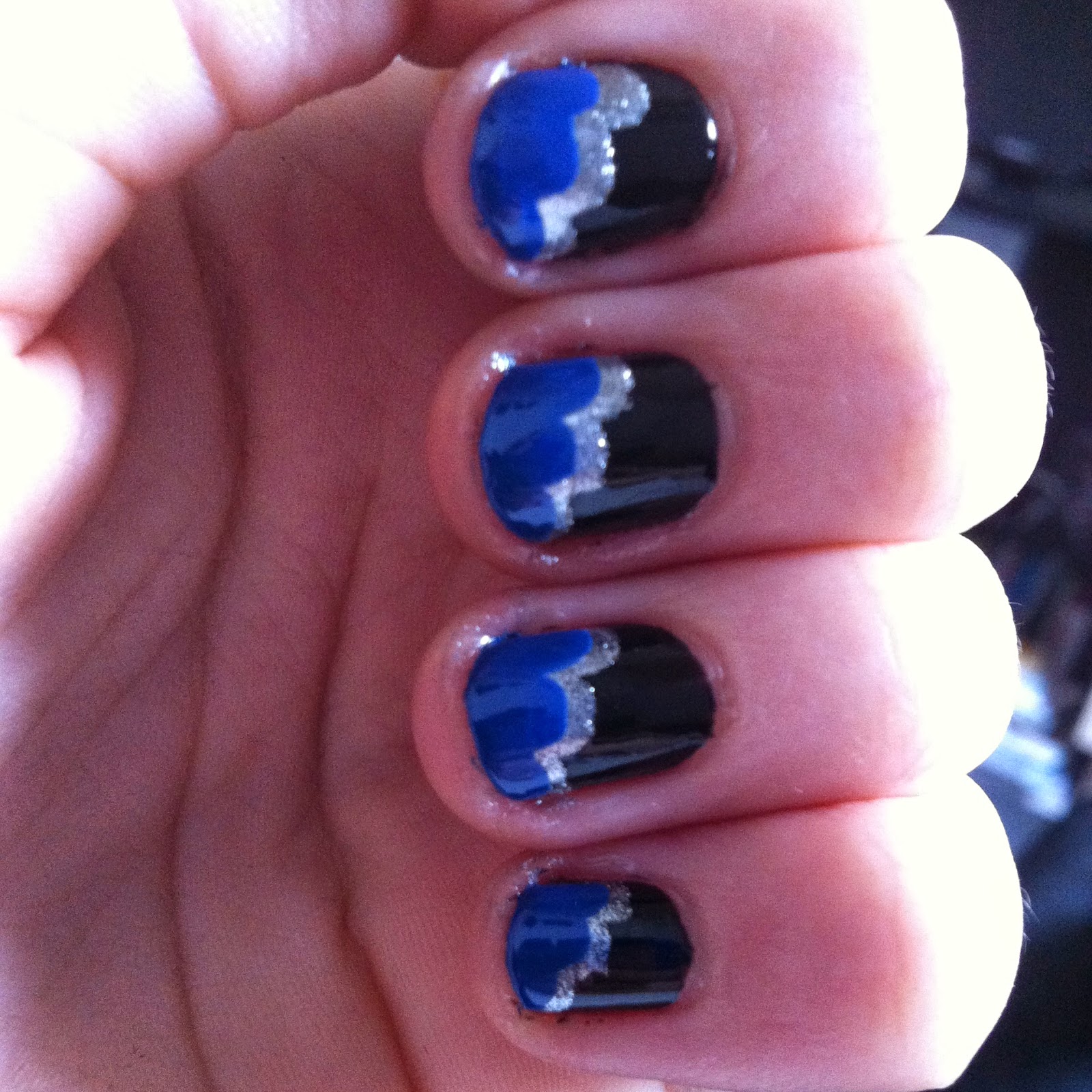For the 'Now' manicure I started off with a black base of Essie Licorice. Afterwards I followed Jane's tutorial using the silver polish Essie No Place Like Chrome and the royal blue polish Essie Mesmerize.